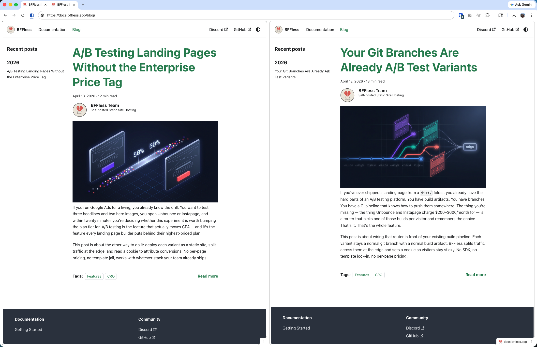 This post is about wiring that router in front of your existing build pipeline. Each variant stays a normal git branch with a normal build artifact. BFFless splits traffic across them at the edge and sets a cookie so visitors stay sticky. No SDK, no template lock-in, no per-page pricing.