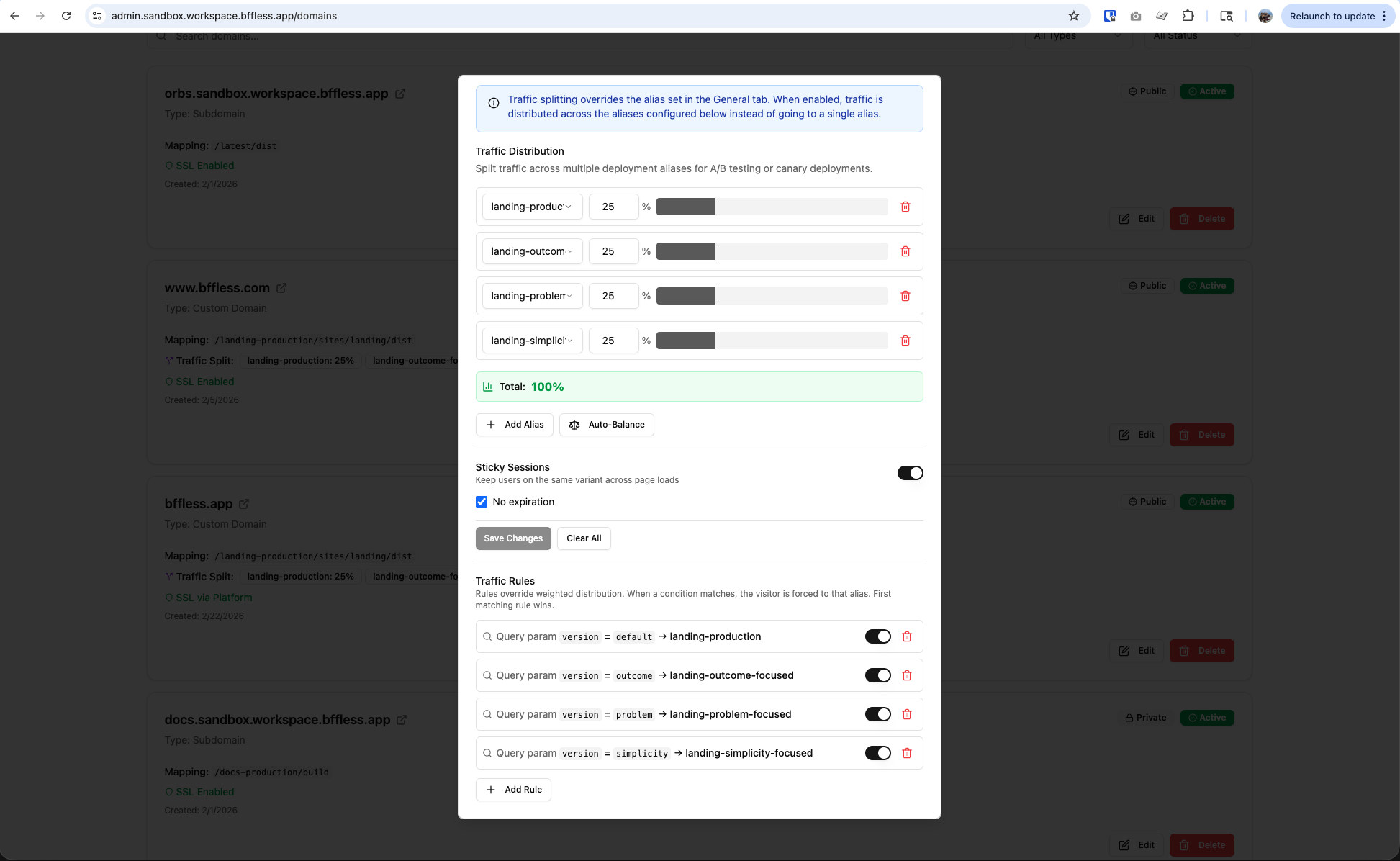 Then just describe the test: "split landing.clientname.com 34/33/33 across landing-main, landing-headline-outcome, and landing-headline-urgency, sticky sessions on, with ?version= query-param rules for each." Claude handles the API calls. Source: claude-skills/plugins/bffless/skills/traffic-splitting.