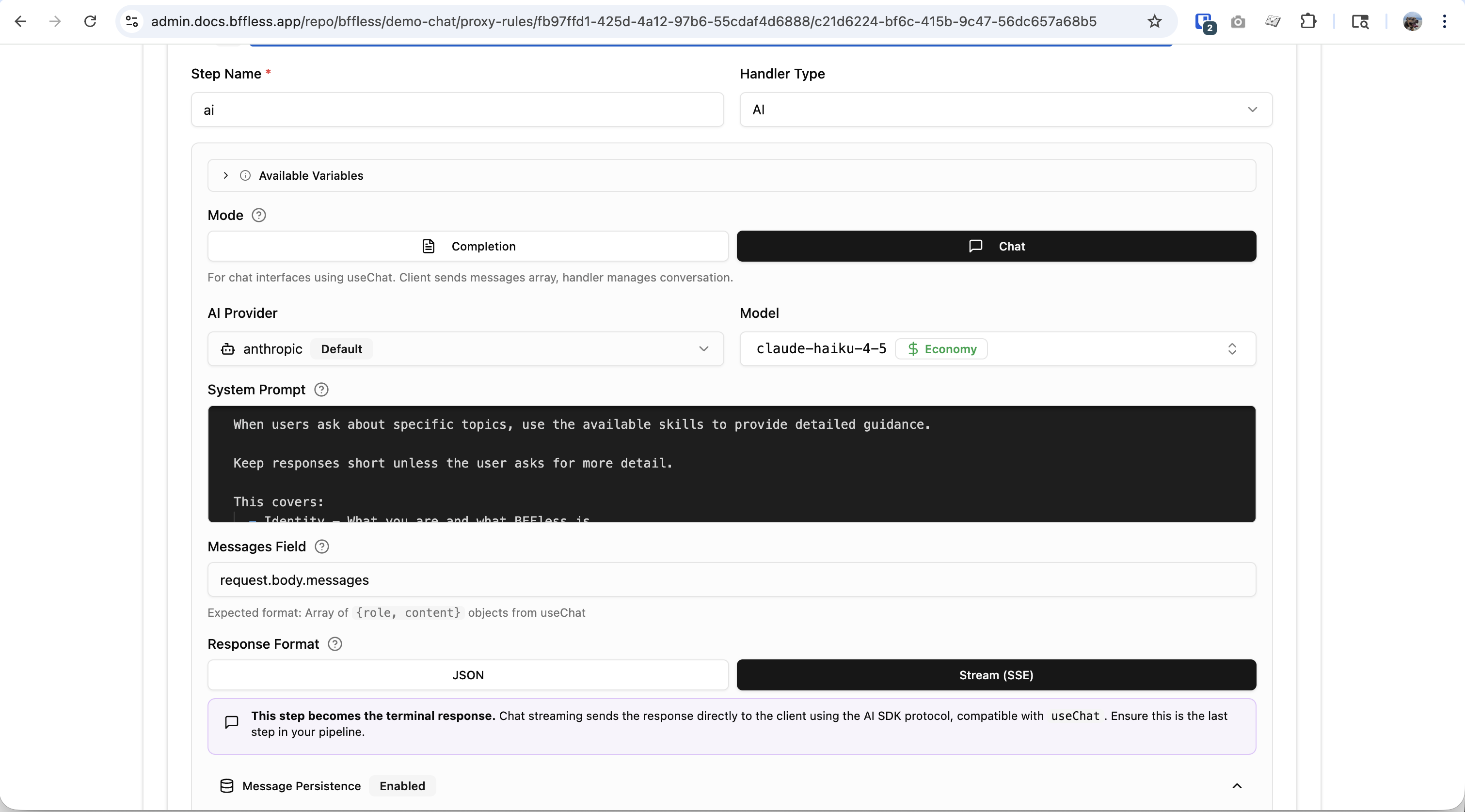 See AI Pipelines — Message Persistence for full configuration details including auto-managed fields and schema setup.