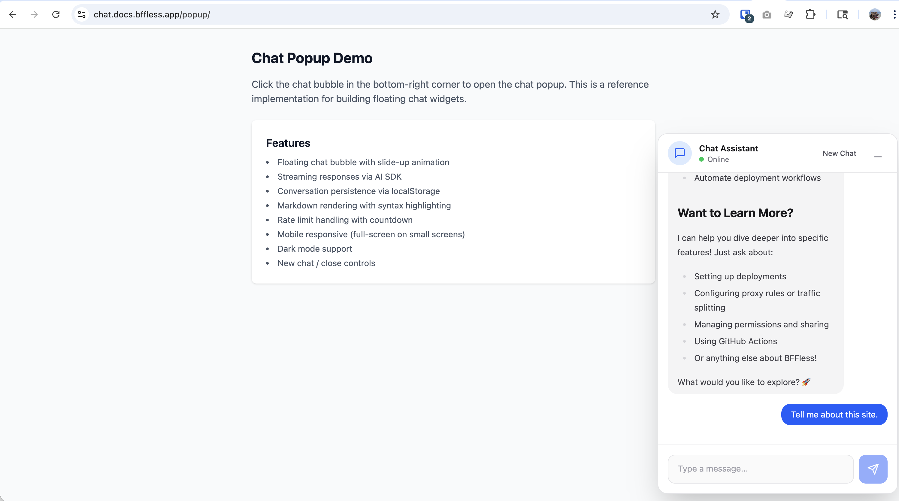 Add an AI-powered chat experience to any site — no backend code required. Choose between a full page chat interface or a popup widget, give your chatbot domain knowledge with skills, and let BFFless handle streaming, persistence, and deployment.