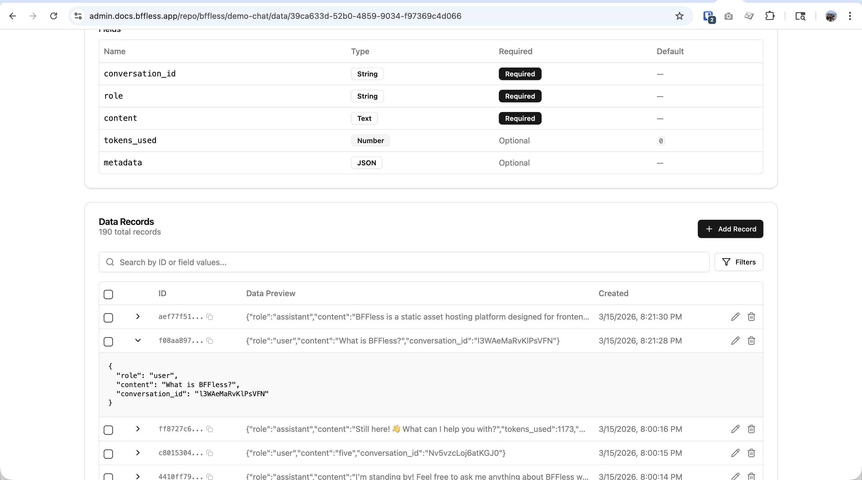 - Message persistence — conversations and messages saved automatically to DB Records