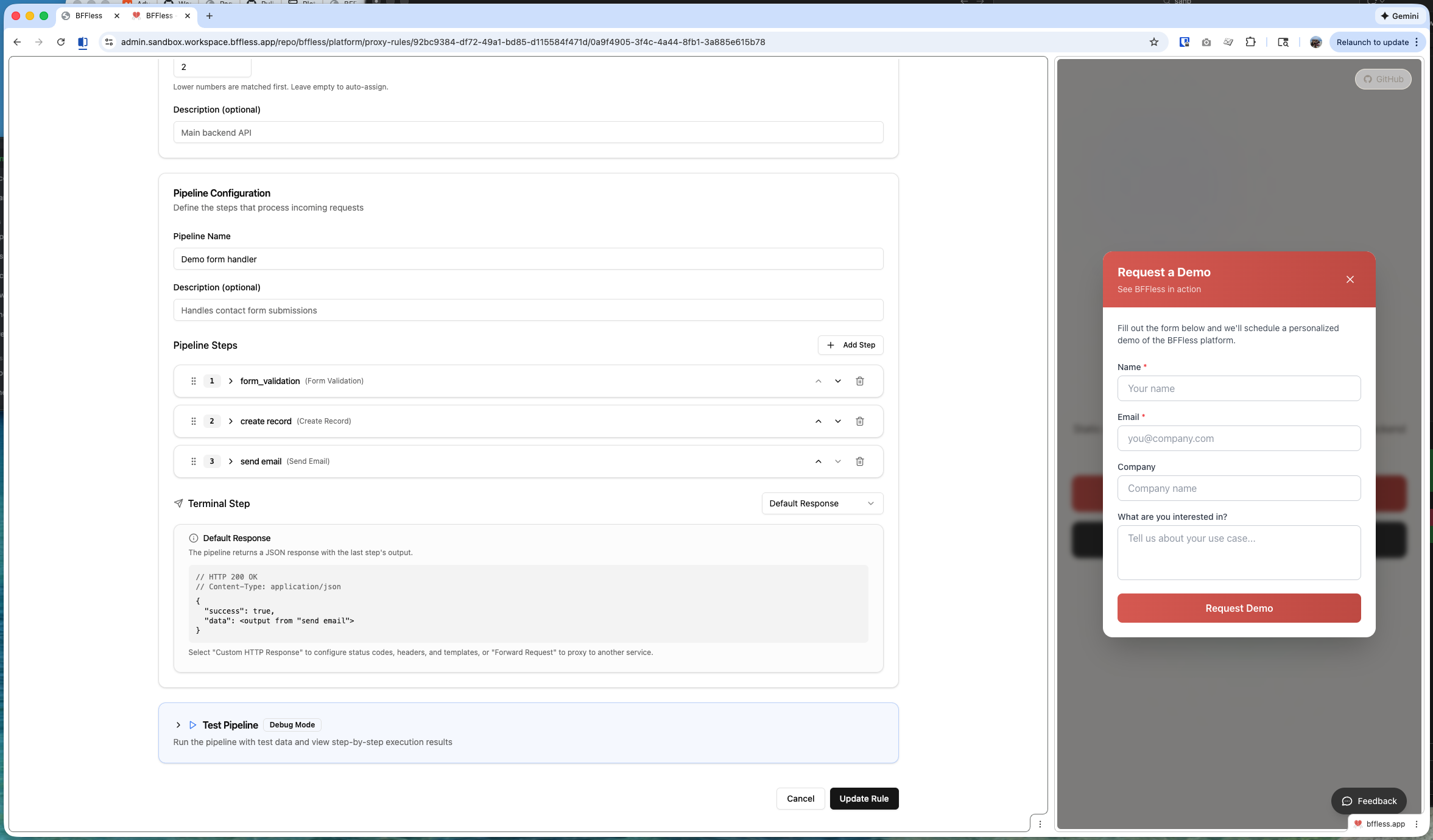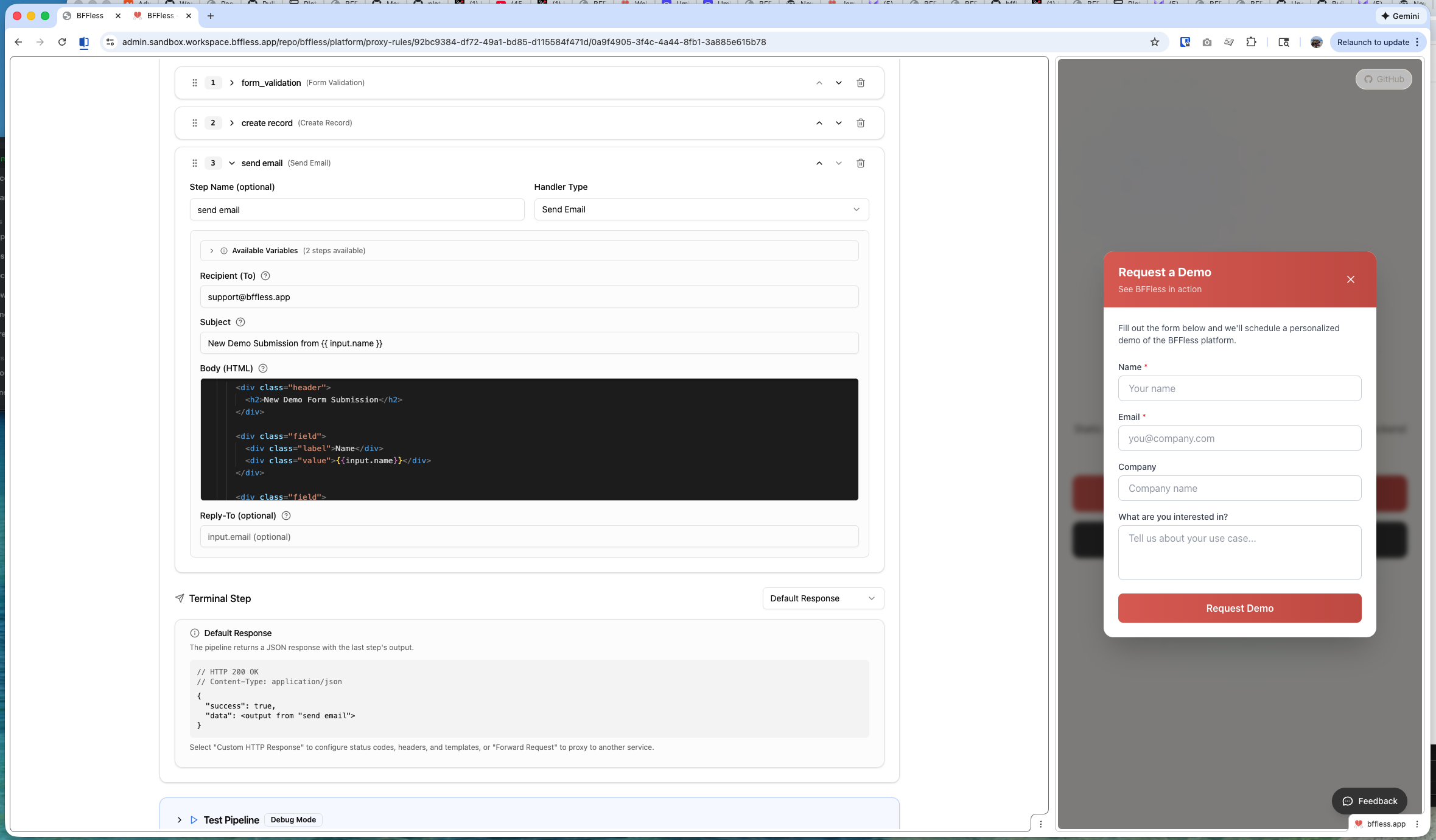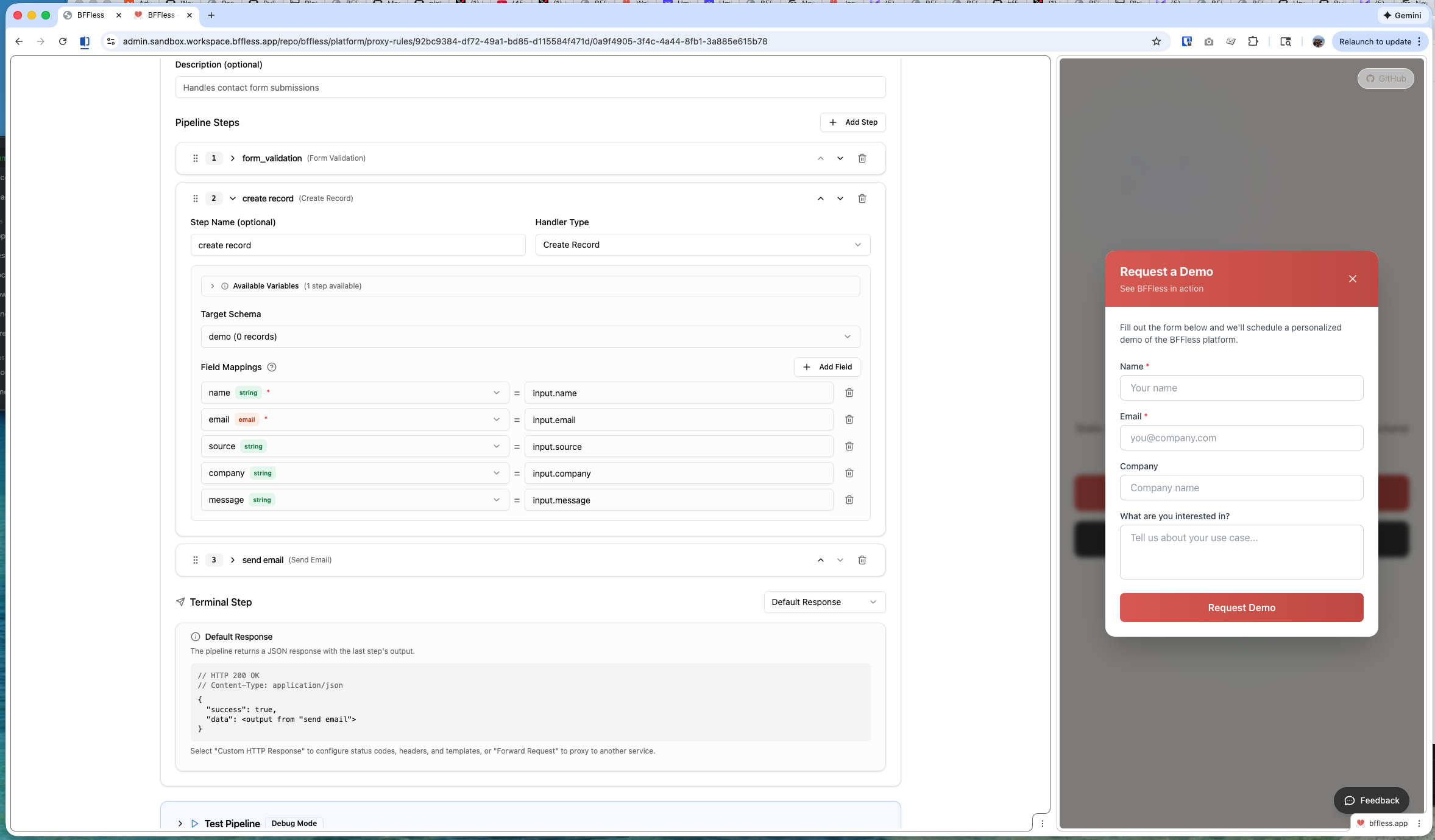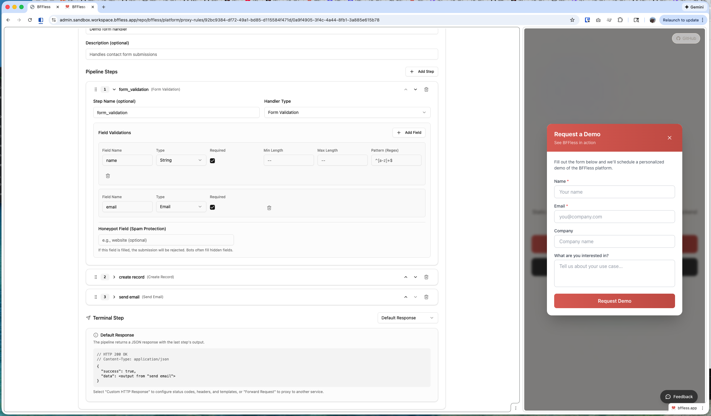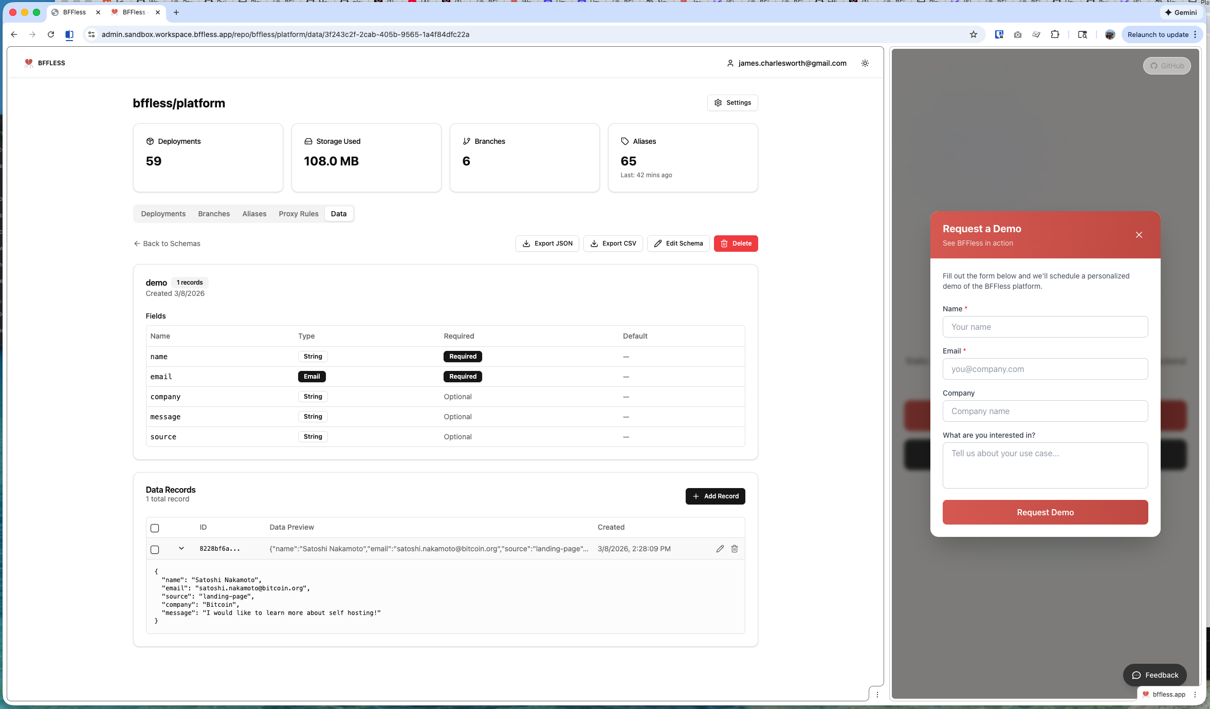- Data persistence - Store form submissions and user data in BFFless DB Records
