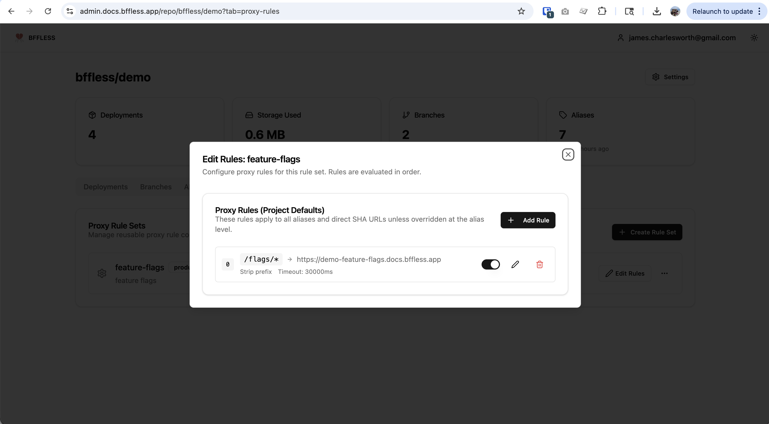 https://demo-feature-flags.docs.bffless.app - Strip Prefix: Enabled - removes