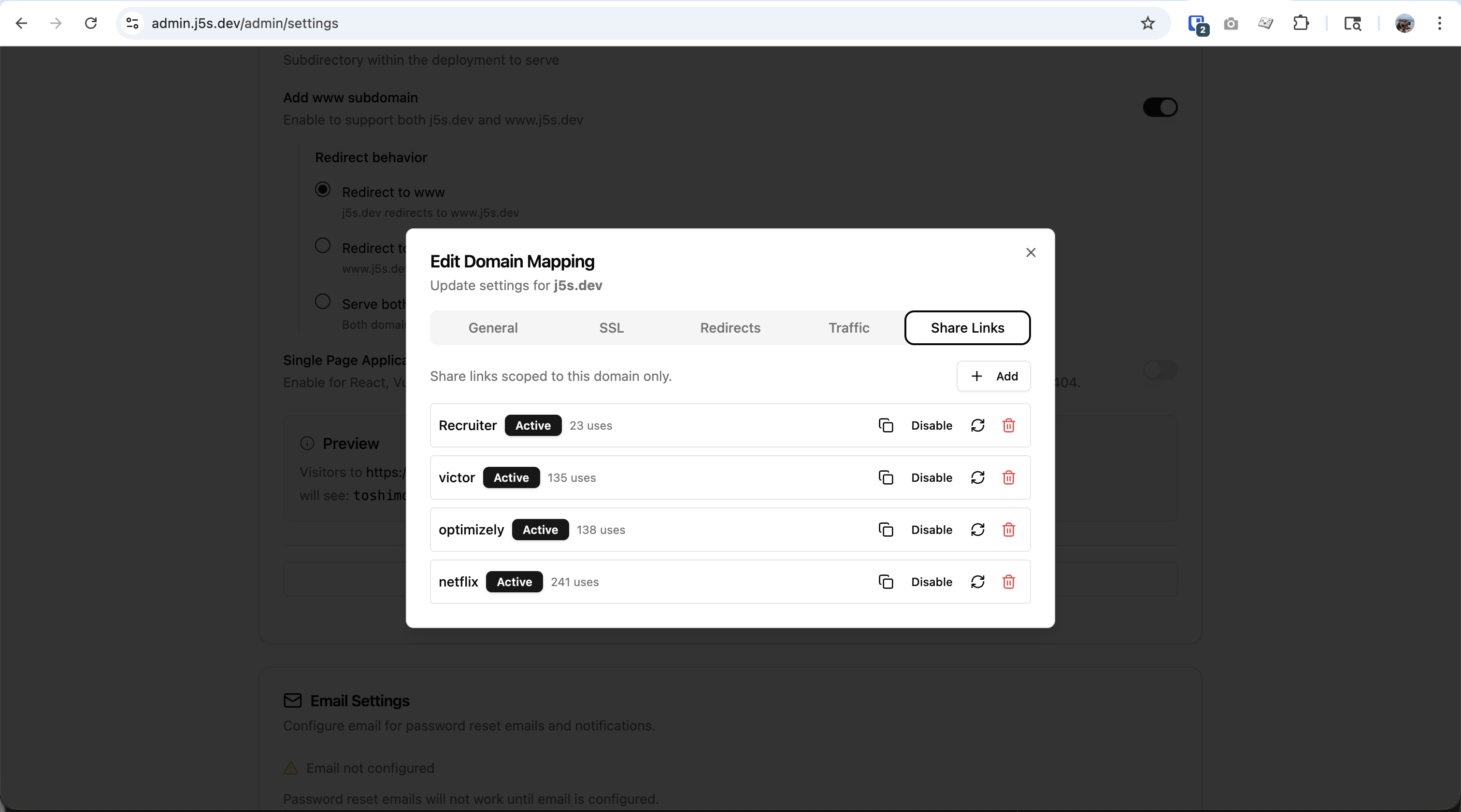 Access share links from Admin → Settings → Domain Mapping → Share Links tab.