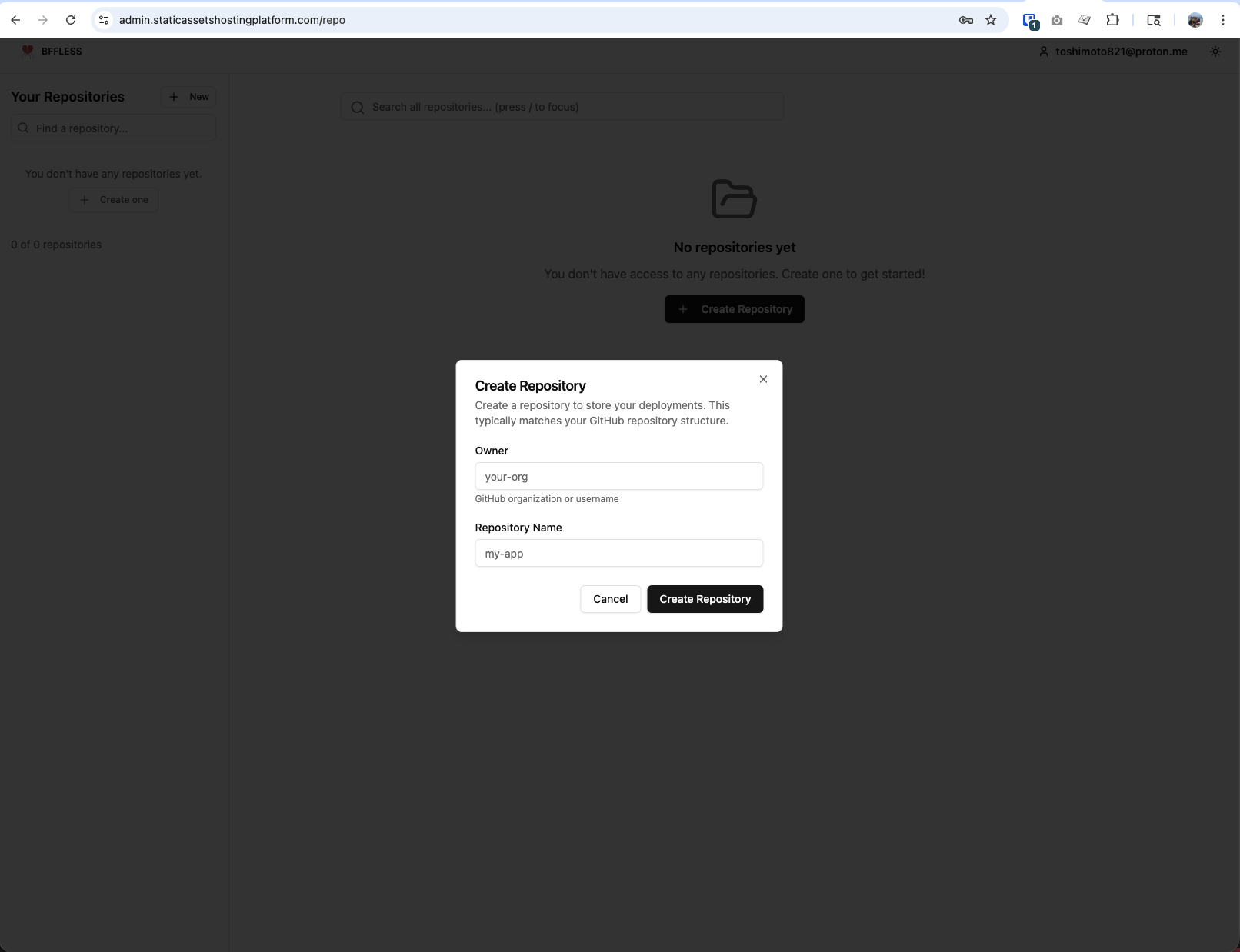 Repositories organize your deployed assets by project. Each repository can have multiple deployments (commits) and aliases (like production, staging).